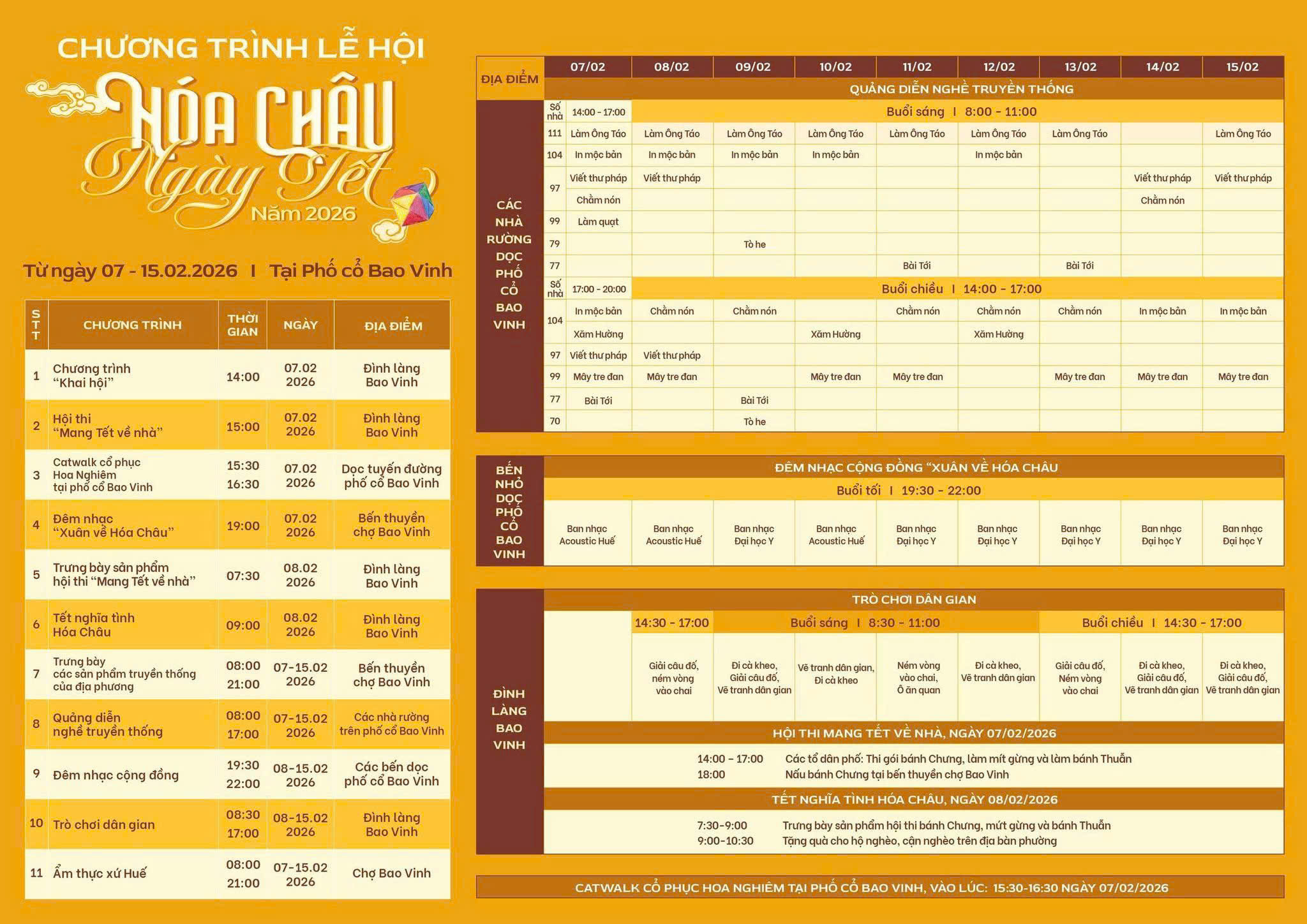 Từ ngày 07/02 đến 15/02/2026 (tức từ 20 tháng Chạp đến 28 tháng Chạp năm Ất Tỵ), Bao Vinh sẽ khoác lên mình diện mạo mới – vừa cổ kính, vừa rộn ràng sắc Xuân. Cao điểm lễ hội diễn ra trong hai ngày 07 – 08/02/2026, hứa hẹn mang đến bầu không khí vui tươi, phấn khởi cho người dân và du khách trong những ngày giáp Tết.